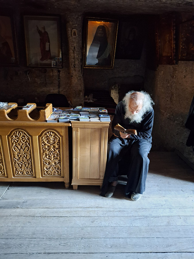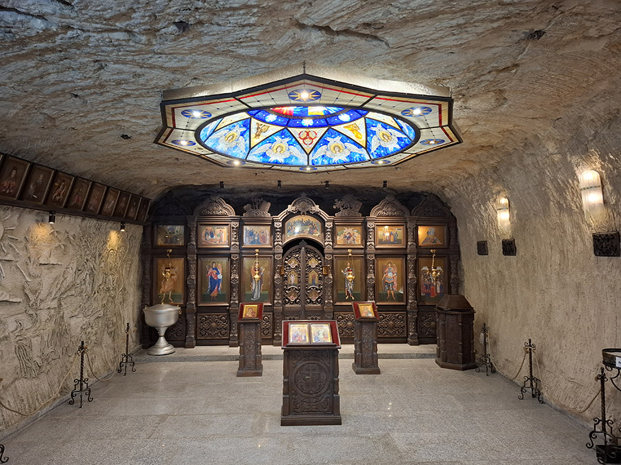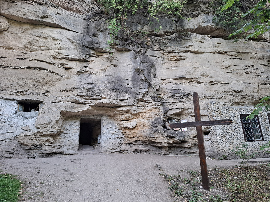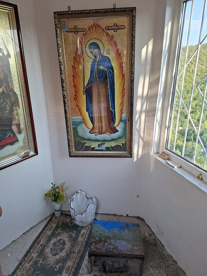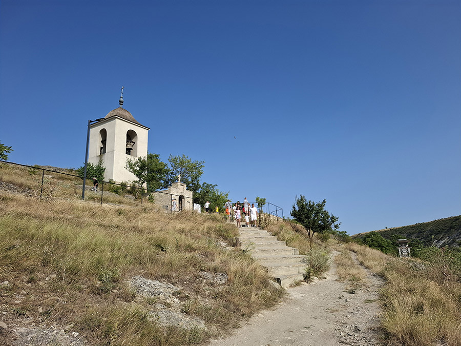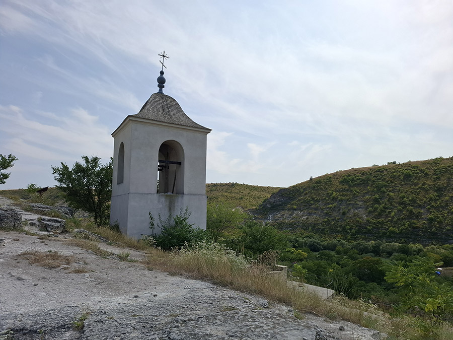 Naprzeciwko krzyża stoi dzwonnica. Pod dzwonnicą znajduje się monastyr Wniebowzięcia Matki Boskiej z XV w. (nazywany monastyr Pestera). Wejście do monastyru jest z drugiej strony, a do środka prowadzi wykuty tunel. Mieszka tu mnich, u którego można kupić różne dewocjonalia i pamiątki. Dalej jest wyjście na skalną półkę, z której rozciąga się widok na okolicę.
