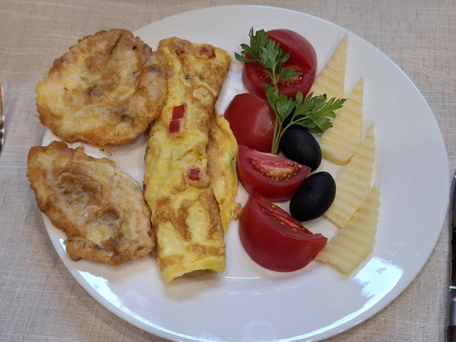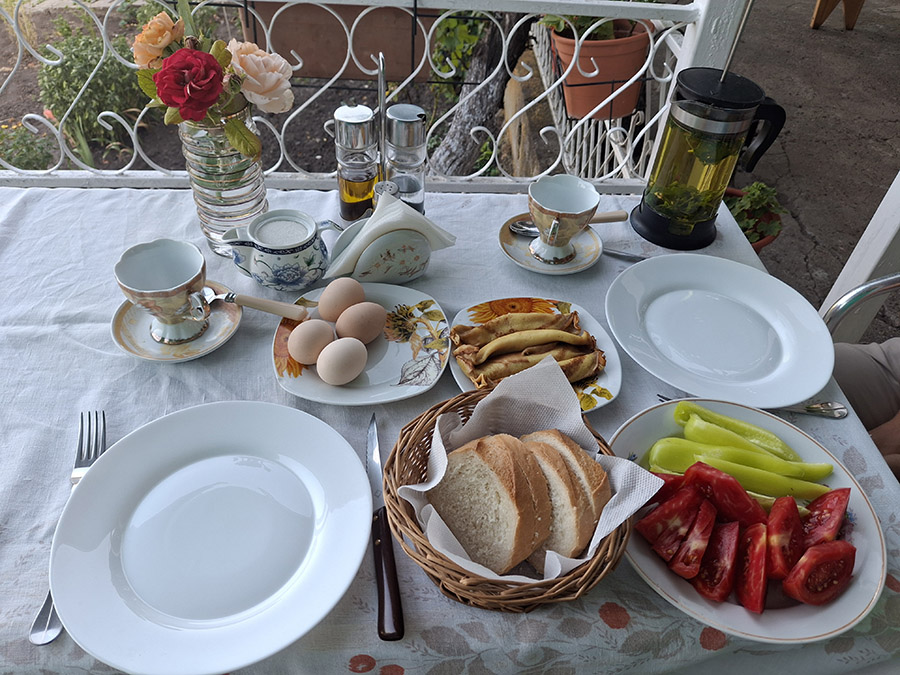 Rano czeka na nas przygotowane prze gospodynię śniadanie - tak duże, że część zapakowaliśmy sobie na drogę. Kupujemy od właścicielki 2 butelki wina (za jedną butelkę płacimy 2,5 zł).