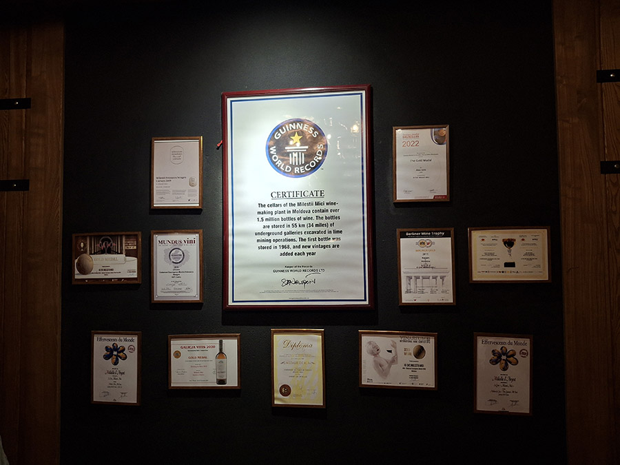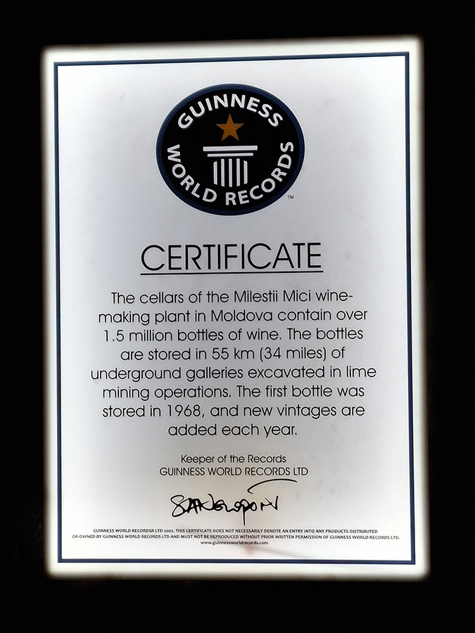 Na ścianie przed wejściem do pomieszczeń zawierających butelki widzimy certyfikat wpisania winiarni do Księgi Rekordów Guinessa
