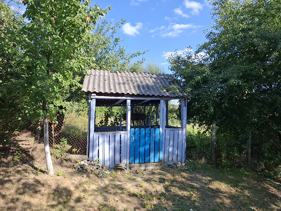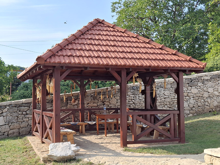 Obok chaty można usiąć i odpocząć w cieniu altany