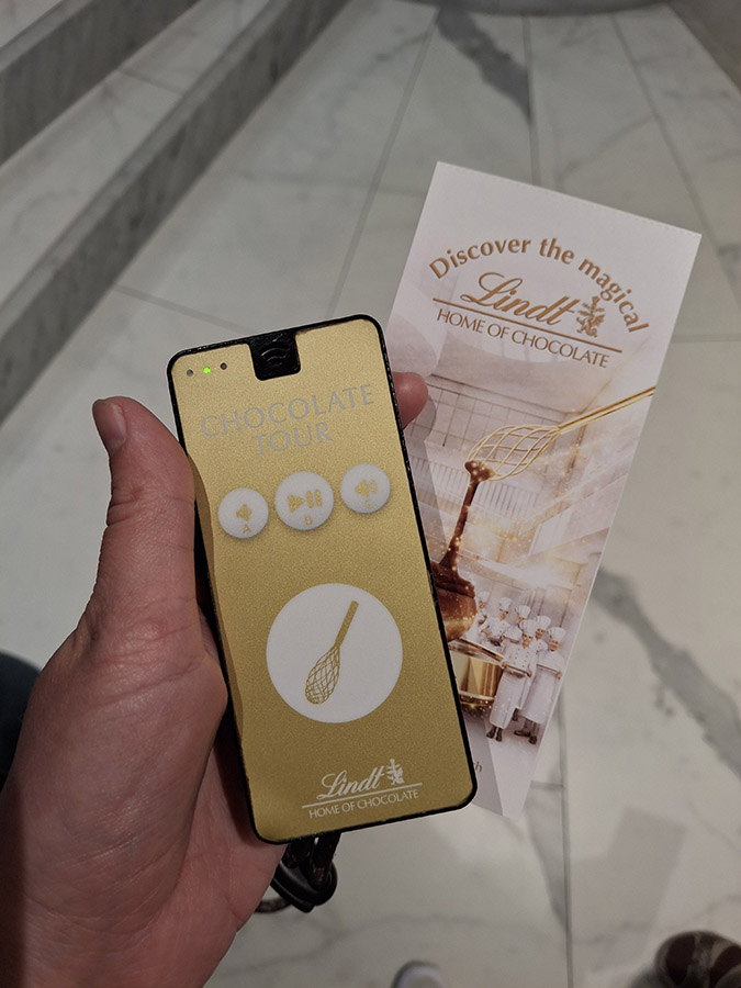 A to jeszcze nie koniec degustacji. W ostatniej sali można spróbować różnych smaków czekoladek Lindt. Zasłodzeni na maksa idziemy jeszcze obejrzeć filmiki m. in. o tym jak AI jest wykorzystane w procesie produkcji i zaglądamy przez szybę na linię produkcyjną. Tuż przed wyjściem czeka na odwiedzających jeszcze jedna atrakcja. Po przyłożeniu biletu do czytnika, wypada złota kula i przemierza tor z przeszkodami po to, by na końcu interaktywny czekoladnik podarował każdemu pyszną czekoladkę. Nam się trafiają rarytasy pomarańczowe i karmelowe.