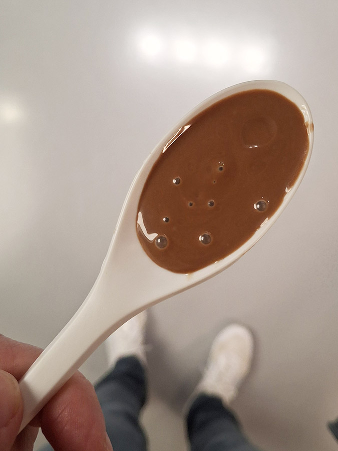 W holu głównym Domu Czekolady znajduje się wielka fontanna czekoladowa, która jest największym tego typu urządzeniem na świecie (prawie 10 m wysokości). I czuć oszałamiający zapach czekolady.