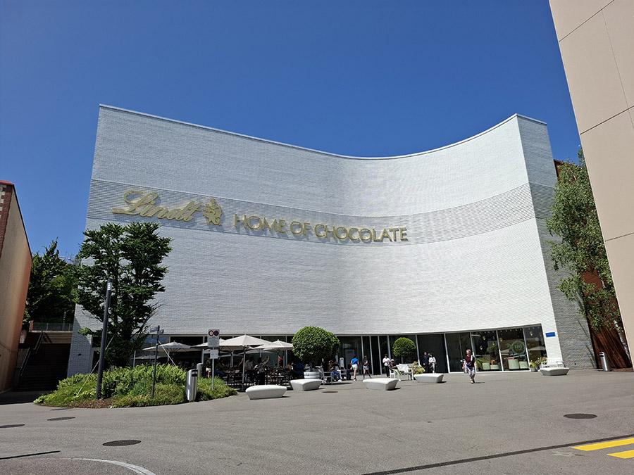 Z kempingu tylko sześć kilometrów dzieli nas od Domu Czekolady Lindt. Gdy przed wyjazdem chcieliśmy na oficjalnej stronie internetowej zarezerwować bilety do muzeum Lindt to okazało się, że miejsca są wyczerpane trzy tygodnie do przodu. W sieci znaleźliśmy informacje, że bilety można dostać kupując Szwajcarską Kartę Turystyczną (Swiss Travel Pass), która obejmuje nieograniczone przejazdy pociągami i autobusami oraz wejściówki do wybranych muzeów, w tym do muzeum Lindt. Inne źródła internetowe mówiły, że Dom Czekolady dysponuje pewną pulą biletów, które można kupić na miejscu w kasie. Liczyliśmy na tę drugą opcję, dlatego byliśmy na miejscu jeszcze przed otwarciem Domu Czekolady. Samochód zostawiliśmy na podziemnym parkingu pod fabryką Lindt i tuż po otwarciu drzwi muzeum staliśmy już przy kasie. Z kupnem biletów nie mieliśmy problemów.