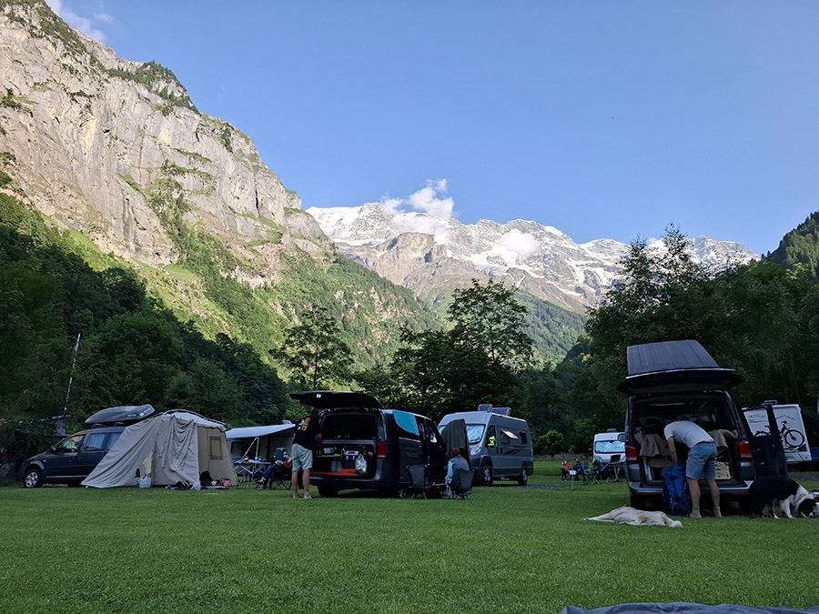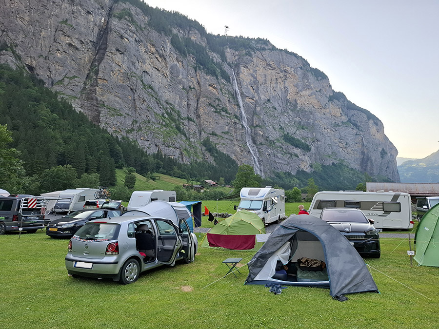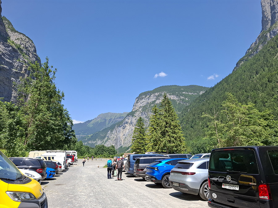 Cztery minuty od kempingu podjeżdżamy do wodospadu Trummelbach. Parking jest bezpłatny i można tu stać samochodem do dwóch godzin. Do wodospadu prowadzi asfaltowa ścieżka, przy której stoi kasa z biletami. Cena biletu to 16 franków.