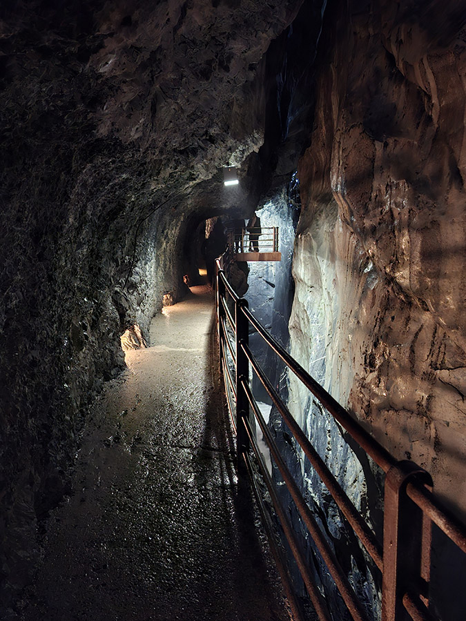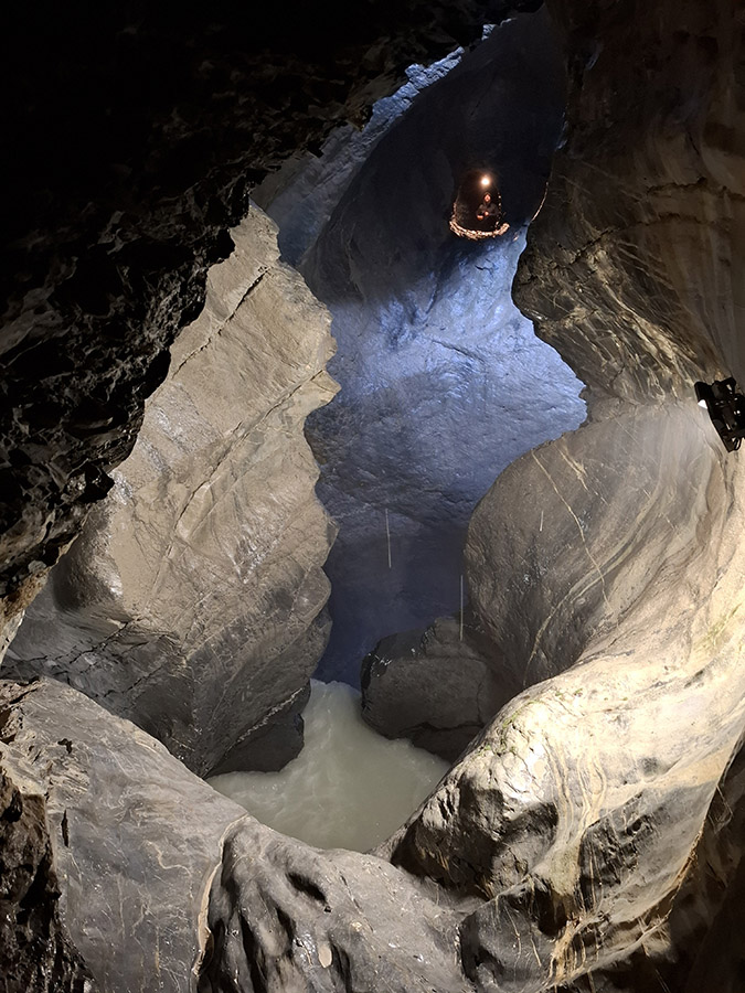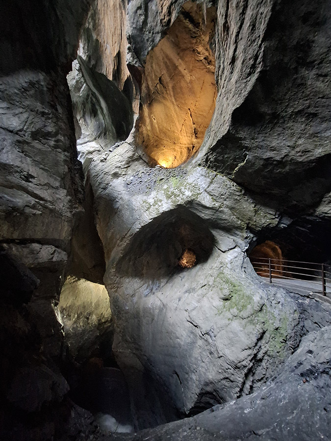Tuż za kasą jest winda, którą można wjechać na poziom szóstej kaskady. Z windy wchodzi się do jaskini. W środku jest zimno i wilgotno. Warto było wziąć ze sobą przeciwdeszczowe kurtki. Woda spływa potężnym nurtem drążąc tunele w skałach i powodując ogromny hałas.