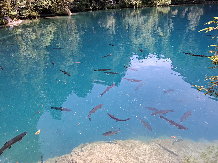 Kolejnym punktem, przy którym się zatrzymujemy jest Blausee. Parking kosztuje tu 5 franków, bilet 11 franków. Krajobraz tego parku natury o powierzchni 20 hektarów został ukształtowany 15 tys. lat temu przez obsunięcie się skał. Obecnie można tu pospacerować po leśnych ścieżkach i pooglądać krystalicznie czyste jezioro, w którym pływają karpie. Zaglądamy również do części pokazowej hodowli karpia, która dzięki czystości wody, dobrej jakości pożywienia i powolnemu wzrostowi czyni pochodzące stąd ryby produktem ekologicznym o wysokiej jakości.