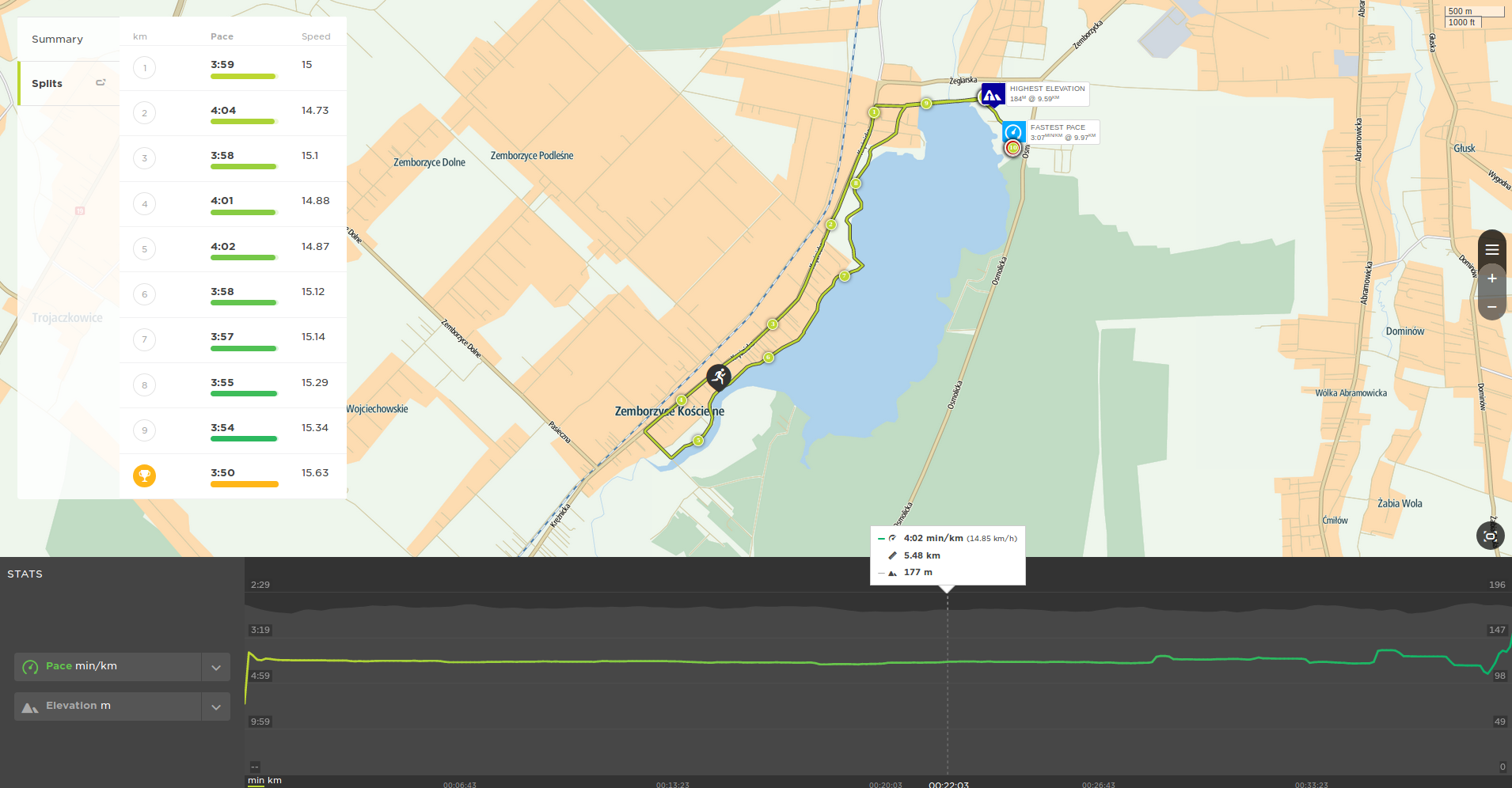 Sprawdzam wyniki, czas brutto 39 minut i 50 sekund, netto: 39 minut i 42 sekundy. Rewelacja. Według tabel Danielsa powinienem pobiec 39:20, ale w taką pogodę? Tylko 20 sekund straciłem? Nie mogę w to uwierzyć. Jak później sprawdziłem ostatnie 3 kilometry biegłem tempem 3:55, a ostatni kilometr 3:50. Wyszedł idealny bieg progresywny. Z planu tworzonego na szybko przed zawodami. Gdyby nie zegarek, to mogło by się nie udać. Dobrze że nie odpuściłem tych zawodów.