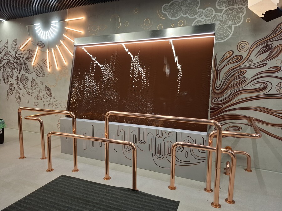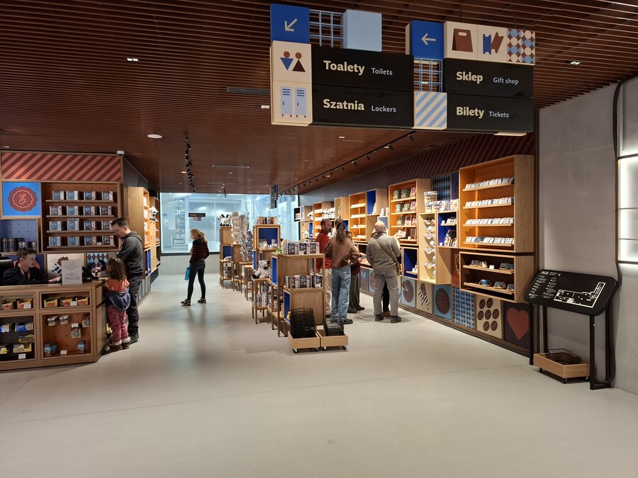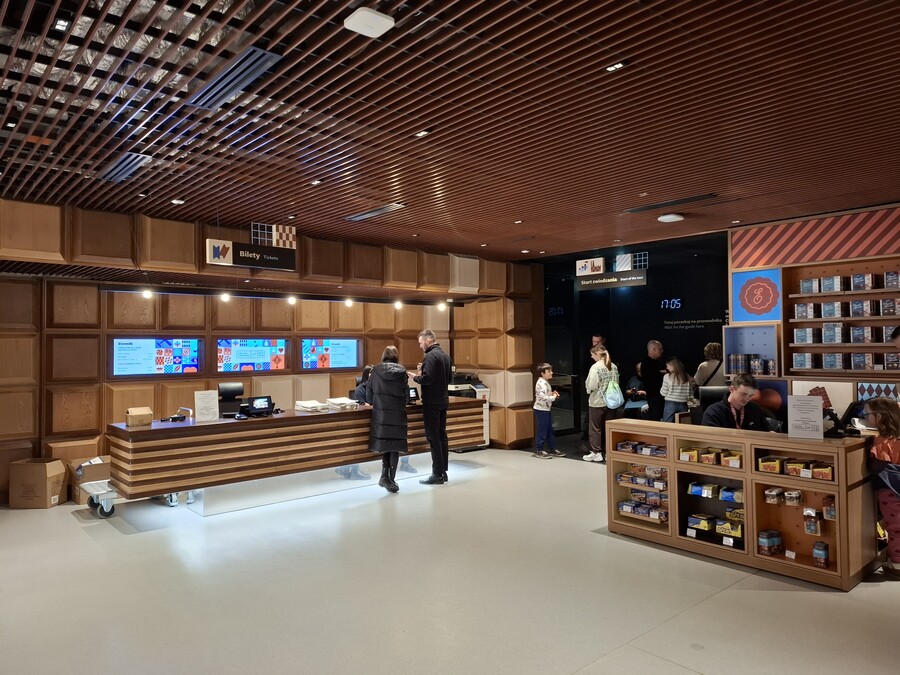 Wejście do nowo powstałego muzeum Wedla mieści się od strony jeziora Kamionkowskiego. Jest tutaj mała pijalnia czekolady, fontanna oraz kilka dekoracji związanych z Wedlem oraz czekoladą. Na niższym piętrze mieści się kasa biletowa oraz sklepik z wyrobami Wedla. Wszystko to jest bardzo nowoczesne i dopracowane w każdym szczególe. Gdzie nie spojrzymy to widzimy motywy związane z czekoladą. Nawet fasada muzeum wyglądem przypomina tabliczkę czekolady. Identyfikacja wizualna projektu muzeum robi na nas bardzo duże wrażenie. Styl oraz grafiki tutaj występujące są ze sobą bardzo spójne. Ciekawostką jest fakt, że najważniejsze funkcje muzeum przedstawiono za pomocą autorskich ikon.