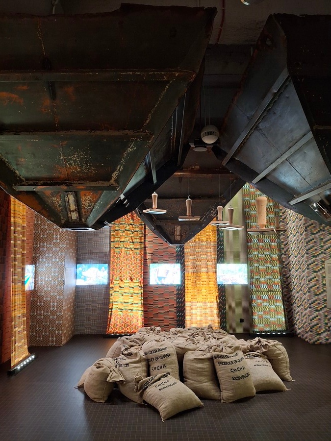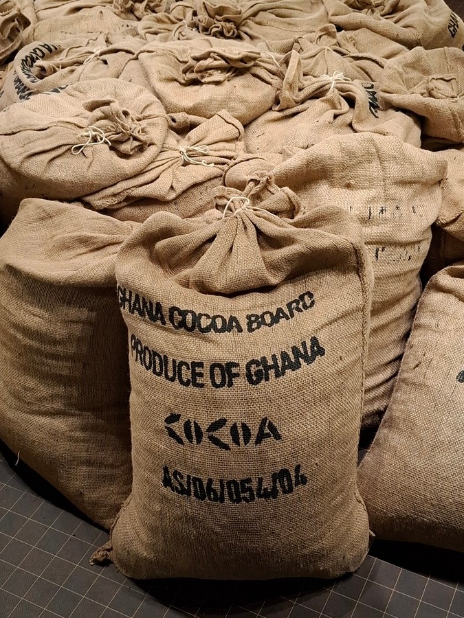 ...oraz worki w jakich transportuje się ziarno kakaowca.