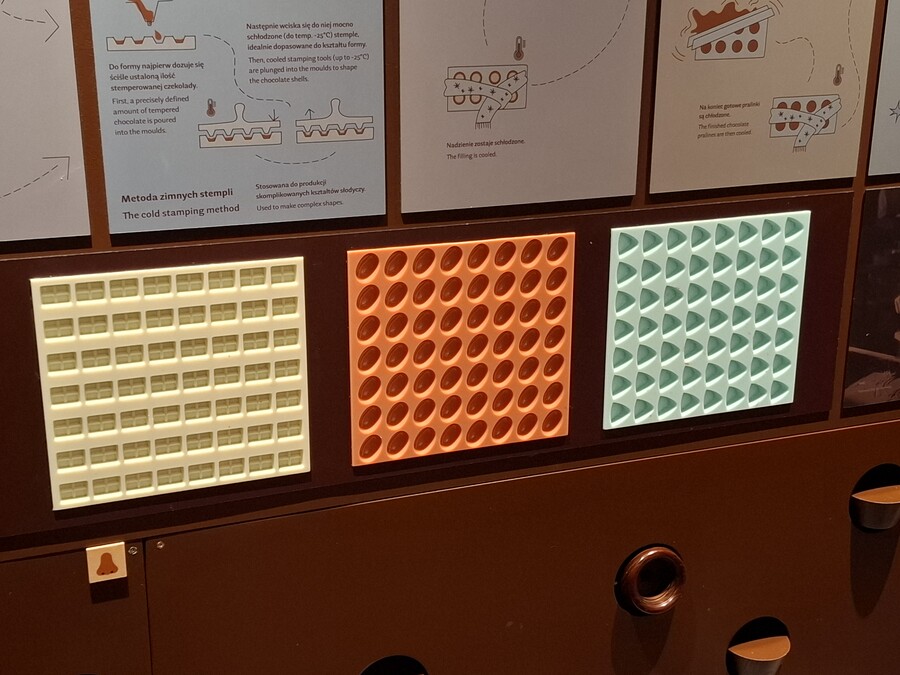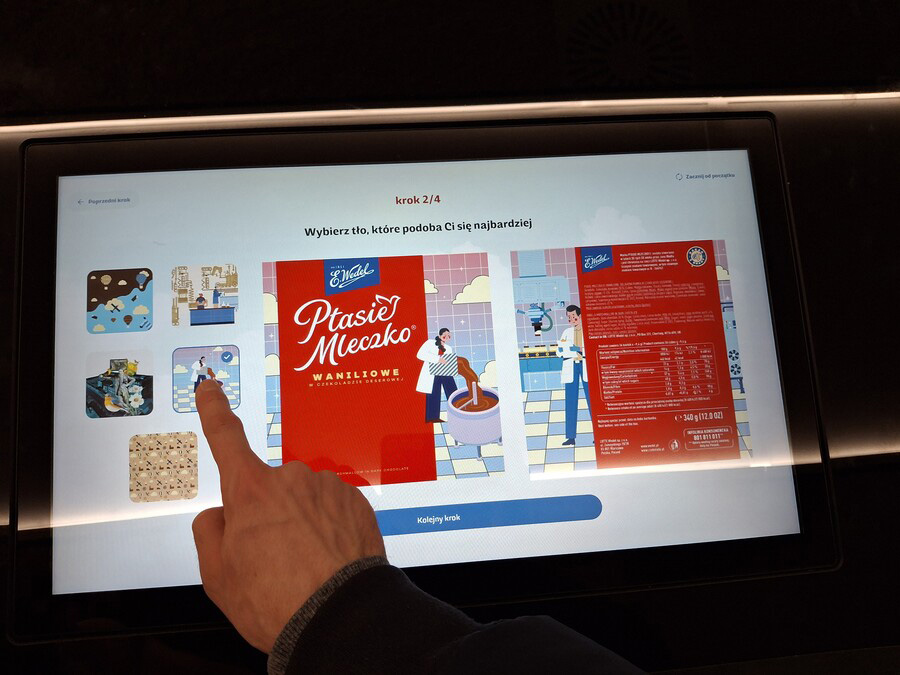 W strefie opakowań można również... zaprojektować własne pudełko czekoladek, a następnie wysłać je sobie na maila! Z dostępnych wzorów jesteśmy w stanie stworzyć własną kreację oraz podpis na czekoladkach. Aplikacja jest prosta i intuicyjna, tak więc nawet najmłodsi powinni sobie z nią poradzić. Na zakończenie zwiedzania z przewodnikiem dostajemy małą czekoladę.