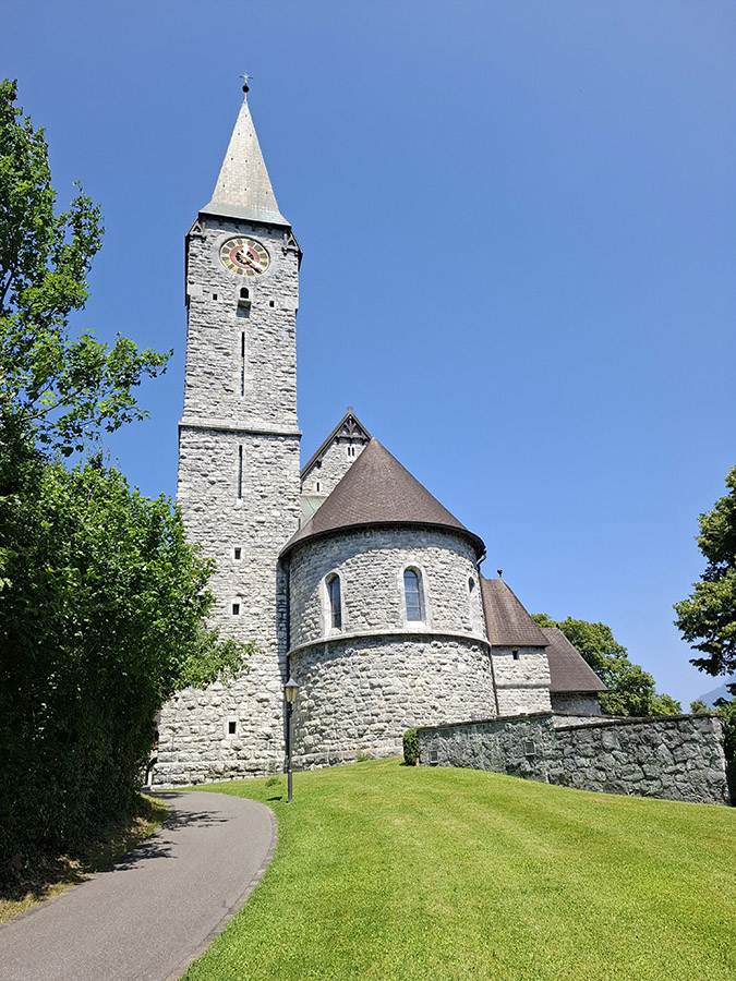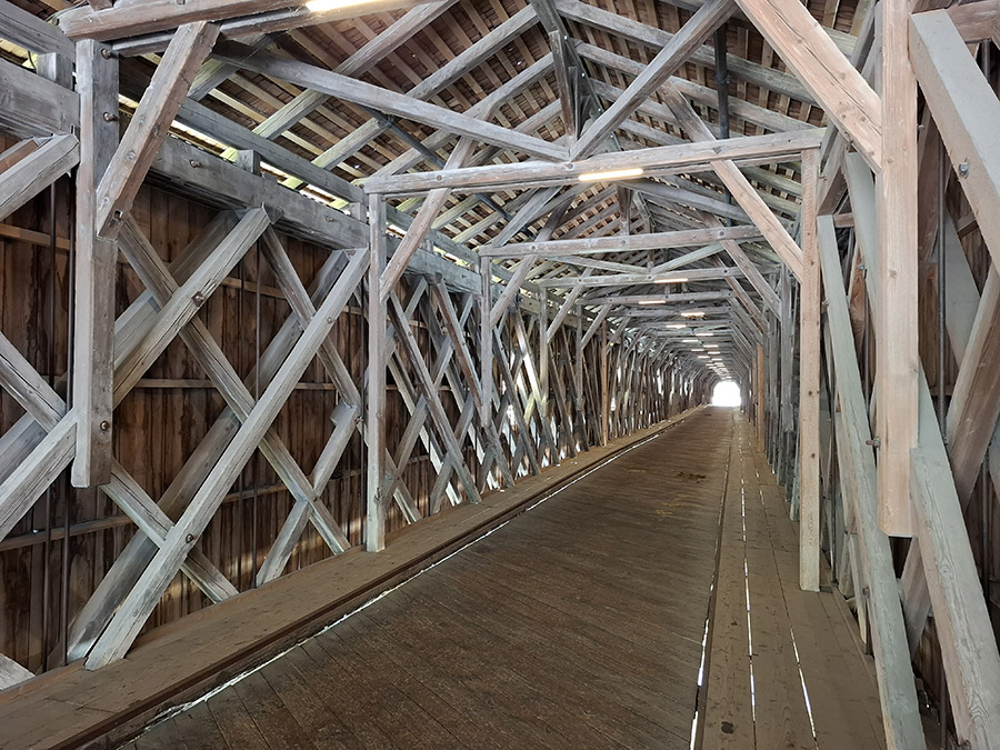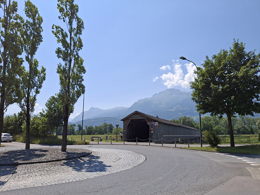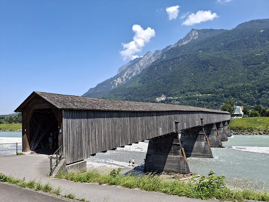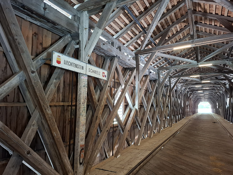 Następnie wychodzimy z centrum miasta na ubocze, żeby zobaczyć ciekawostkę: Alte Rheinbrücke Vaduz–Sevelen na rzece granicznej między Liechtensteinem a Szwajcarią. Jest to 135-metrowy most z 1901 roku. To ostatni, drewniany most na Renie, który przetrwał do naszych czasów. Obecnie obsługuje ruch pieszy i rowerowy. Przez zadaszony most wstępujemy jeszcze na chwilę do Szwajcarii, a potem spacerujemy bocznymi uliczkami zwracając uwagę na czystość i porządek. Zachwycamy się takimi detalami jak zadbane rabaty kwiatowe, zielone miejskie balkony czy przypadkowa doniczka z kwiatami.