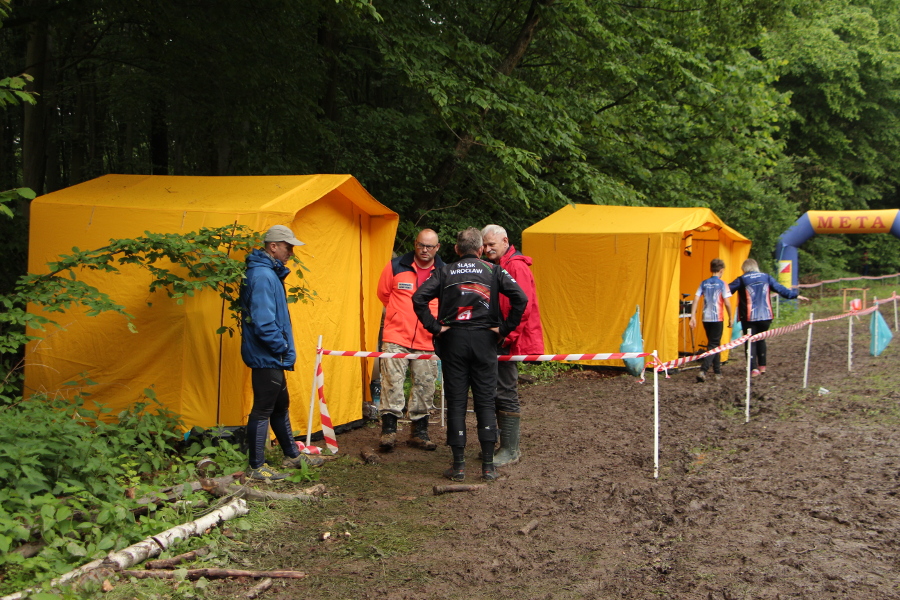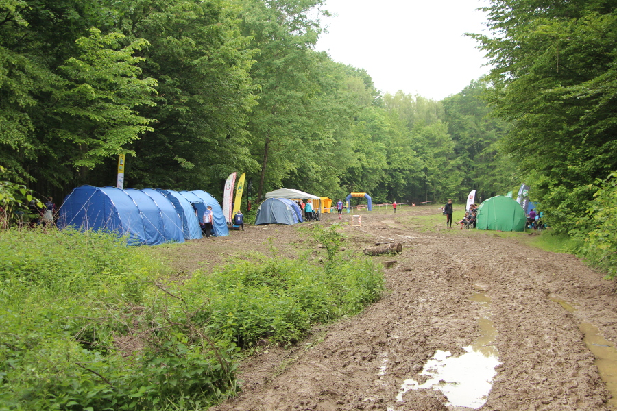 Docieramy do biura. Dowiadujemy się, że kwarantanna obowiązuje i trzeba dotrzeć na start za około 45 minut. Organizatorzy pytają się nas czy mamy namiot. Tego zupełnie nie przewidziałem. Widzimy jak zawodnicy niosą namiot, krzesełka, parasole i cały pozostały osprzęt biwakowy by przetrwać tych kilka godzin na starcie. Dobry pomysł, ale my jesteśmy początkujący i kompletnie nie przygotowani w ten sposób. Następuje stresująca chwila. Nie wiadomo czy iść do auta szykować się na start, czy iść na start zorientować się jak to wygląda w rzeczywistości. Dodatkowo dzień jest chłodny i pochmurny, może padać deszcz. Zieleń również jest bardzo mokra bo cały tydzień padało. Nie wiemy jak się zorganizować.