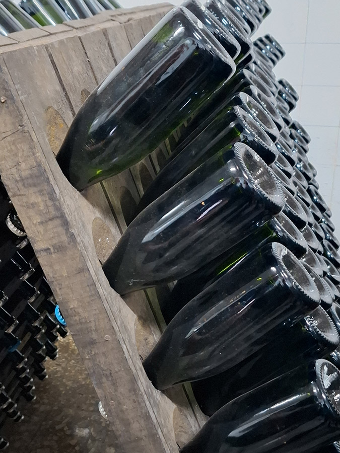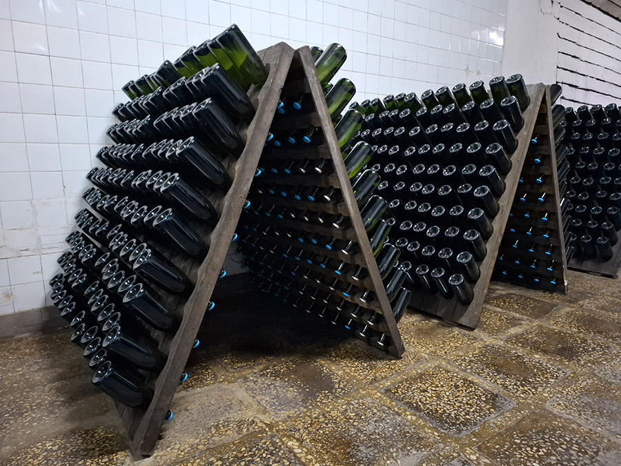 Piwniczka w gospodarstwie wypełniona jest butelkami wina...