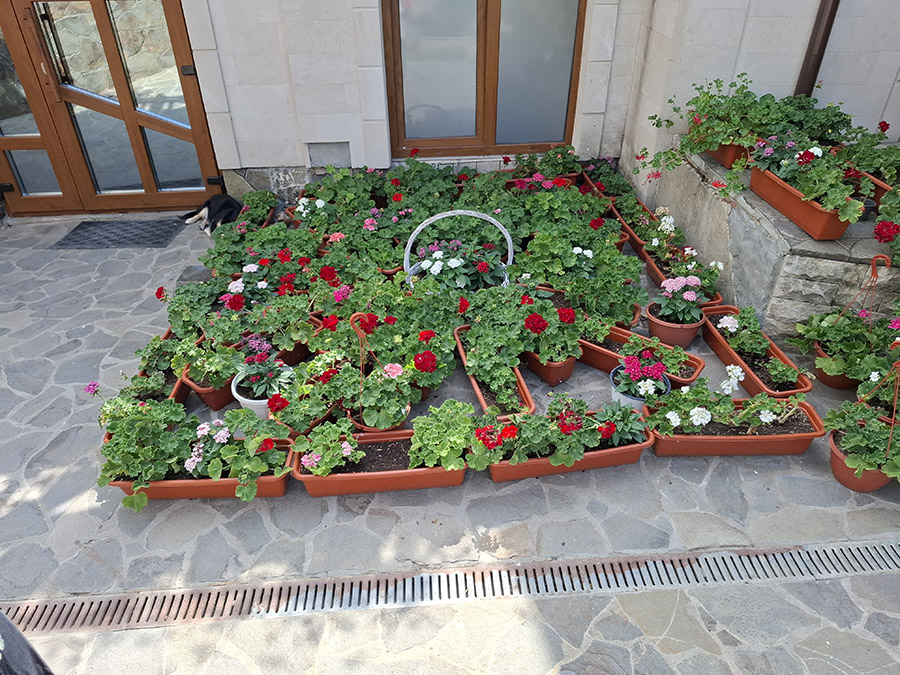 Na terenie cerkwii znajduje się mnóstwo pelargonii...