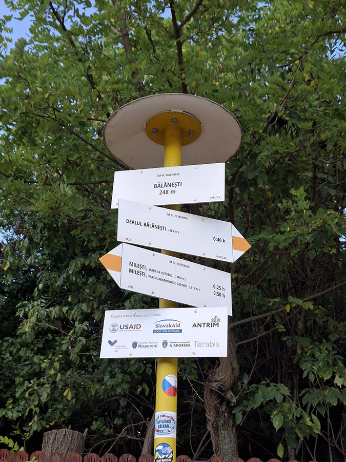 Obok sklepu we wsi Bălăneşti widzimy znak prowadzący na szlak do szczytu