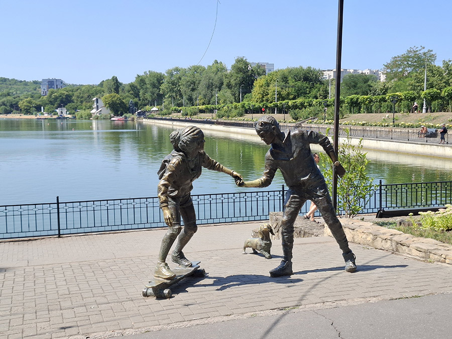 Pomnik chłopaka, dziewczyny na deskorolce oraz jamnika