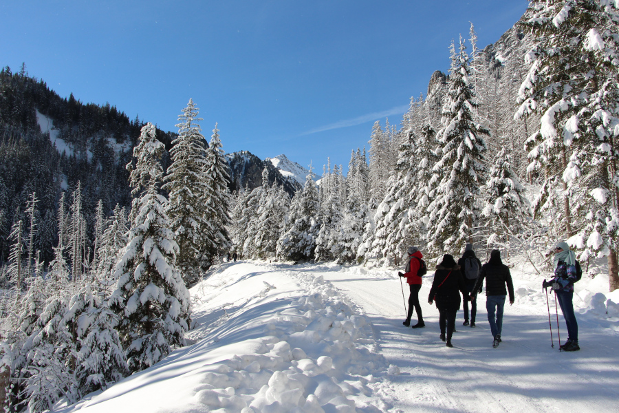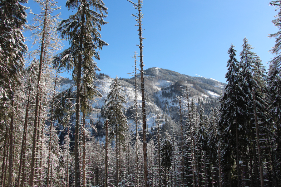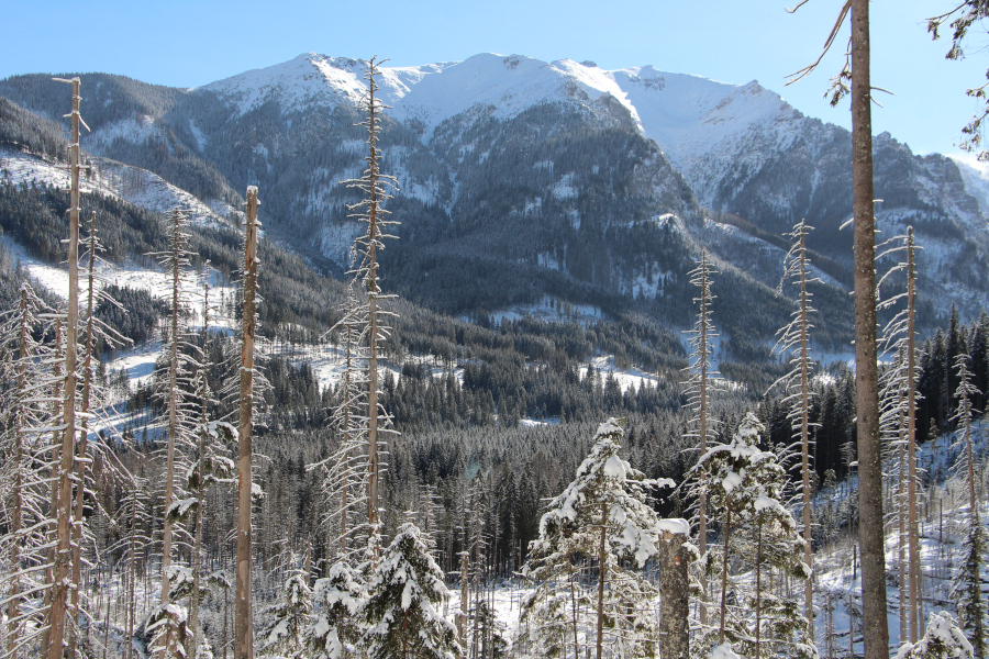Jest bardzo mroźno. Czuję jak ręce zamarzają mi na kijkach pomimo dwóch par rękawiczek. Tak bardzo chcę zobaczyć góry w zimie iż kompletnie mnie to nie rusza. I już po chwili pojawia się pierwsza okazja na pierwsze widoki. Majestatyczne zaśnieżone szczyty wyłaniają się zza każdego kolejnego mijanego przez nas zakrętu.