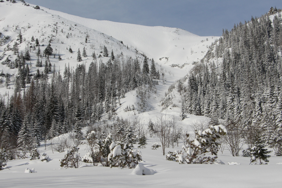 Powoli dochodzimy do celu. Po drodze mijamy żleb którym często schodzą śnieżne lawiny. Na jego dole widać sporej wielkości kopiec śniegu.
