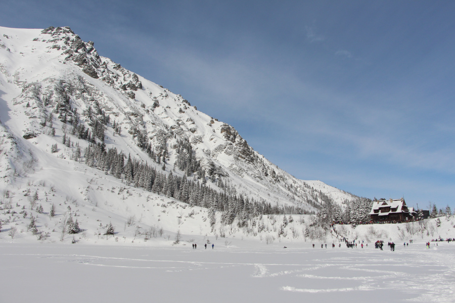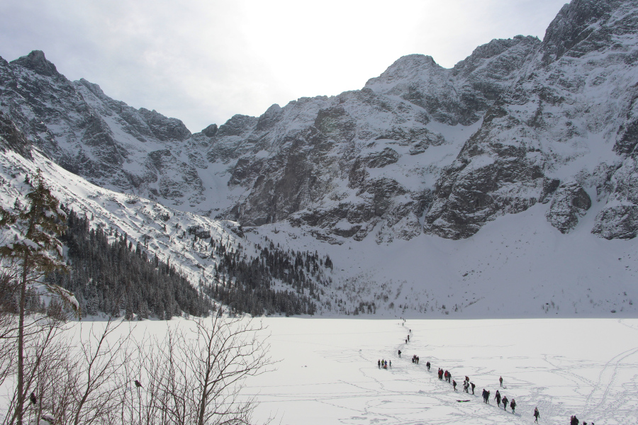 Tego dnia Morskie Oko jest zamarznięte i pokryte śniegiem. Wygląda jak jedna wielka śnieżna polana, przez środek której przemieszczają się obecnie ludzie. Widok ciekawy, aczkolwiek myślę, że latem wygląda to bardziej imponująco. Co innego okoliczne szczyty. Swoją wielkośćią robią ogromne wrażenie. Zwłaszcza w zimowej scenerii, gdy przyroda wydaje się dużo groźniejsza i mniej przystępna.