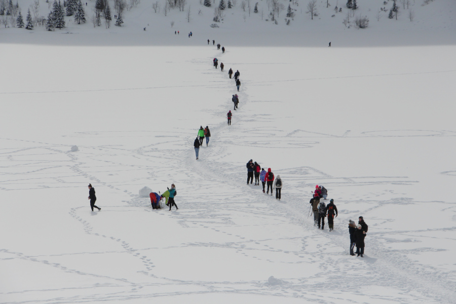 Pochód turystów przez Morskie Oko w kierunku Czarnego Stawu