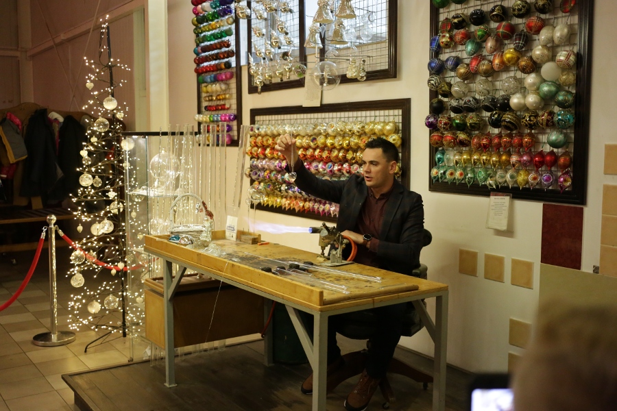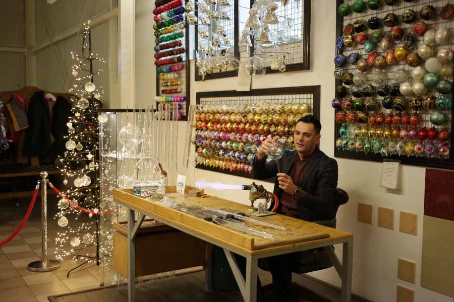 Po wyjściu z sali znajduje się stanowisko prezentacyjne, gdzie odbywają się pokazy wytwarzania bombek. Bombki wytwarza się z rury sodowej, którą trzeba najpierw rozgrzać nad palnikiem do 800 stopni. Następnie mamy 5 sekund na włożenie rozgrzanego szkła do aluminiowej formy i precyzyjne dmuchnięcie w rurkę w celu uzyskania pożądanego kształtu. Aby móc dmuchać bombki zawodowo, potrzeba 5 lat praktyki...