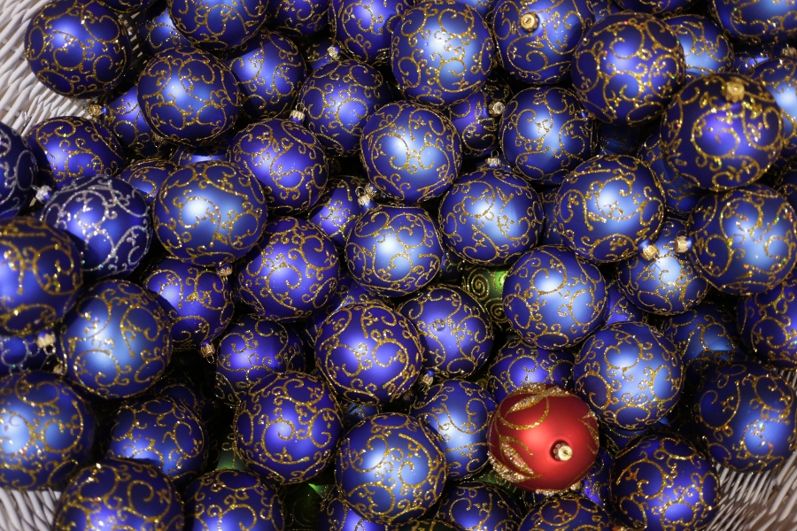 Bombki o bardziej klasycznym kształcie, wszystkie pięknie ozdobione ręcznymi malowidłami