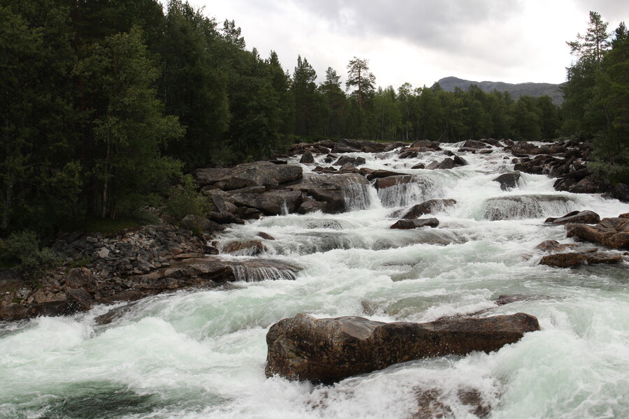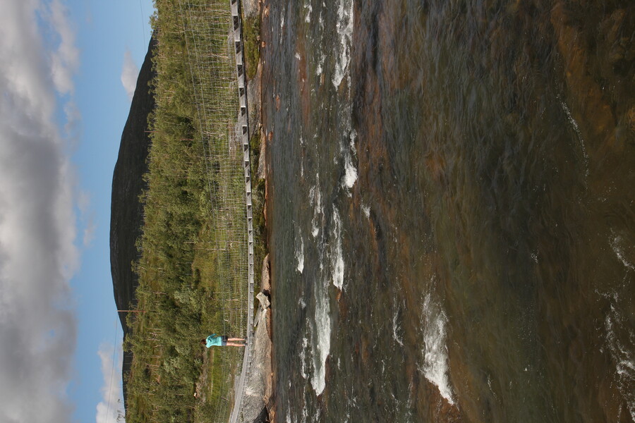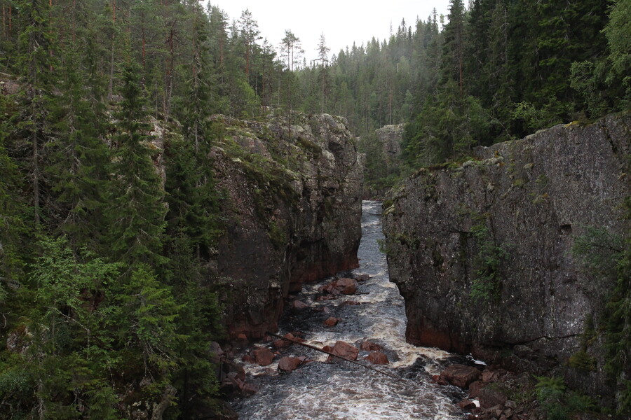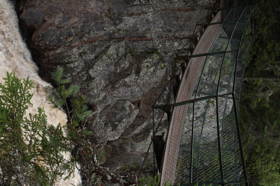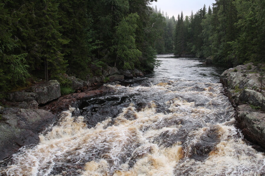 Pod wieczór wstępujemy zobaczyć wodospad Helvetesfallet. Grupa Szwedów uprzedza nas, żeby uważać bo kamienie i drewniane schody, które prowadzą nad wodospad są śliskie. Woda w rzece płynie z dużą prędkością i jest jej bardzo dużo. Nad rzeką, której nurt wyżłobił kanion, jest powieszony drewniany most. Przechodzimy na drugą stronę, robimy parę fotek i wracamy szukać miejsca na nocleg. Namiot rozbijamy kilka metrów dalej, w zatoczce przy drodze. Słyszymy tu jeszcze szum wodospadu, który zakłócają dźwięki ulewy.