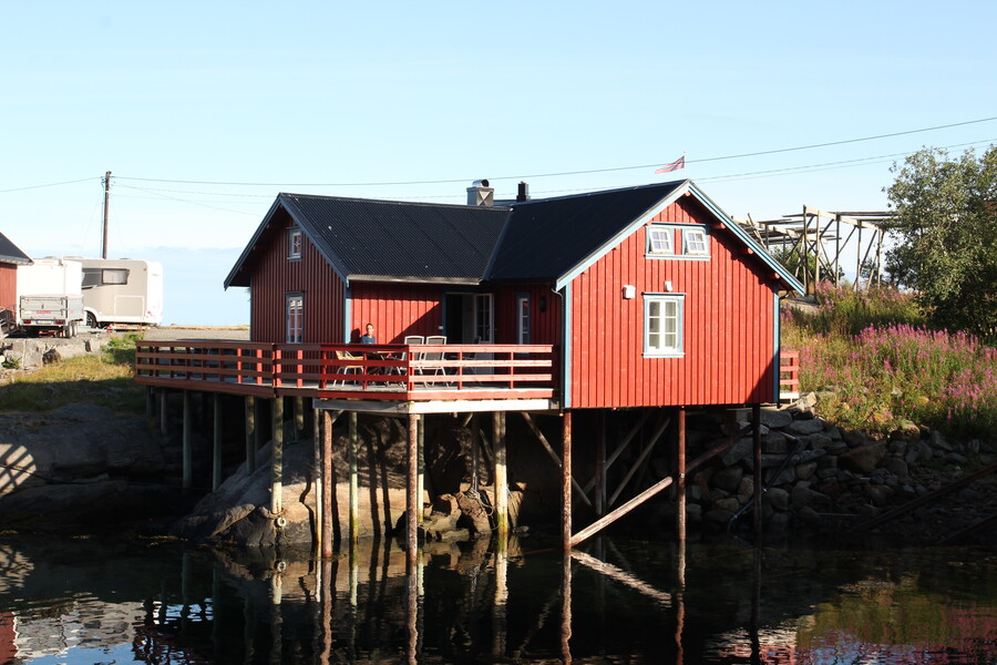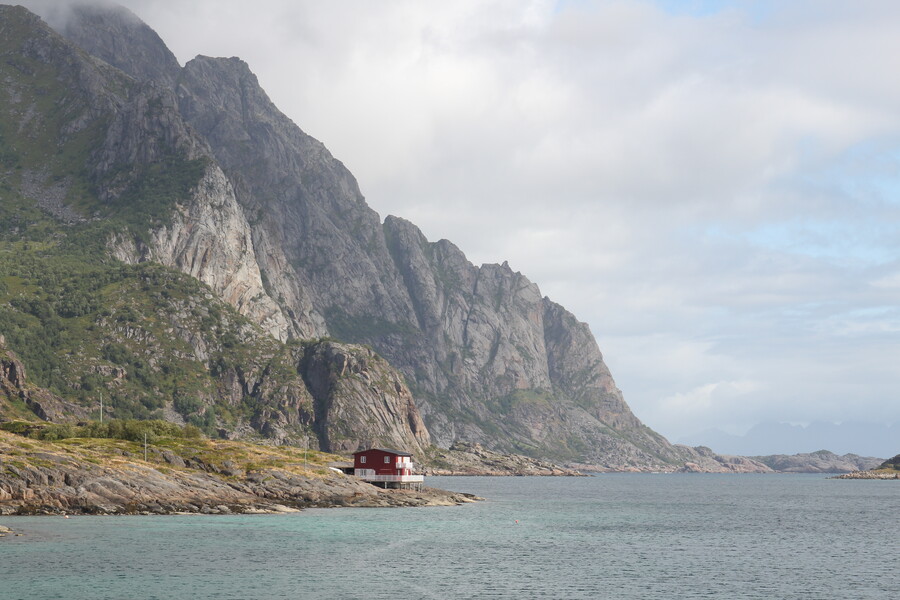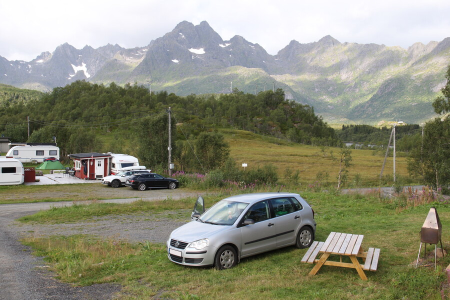 Opuszczamy Lofoty. Port Moskenes, z którego odpływamy do Bodo, jest tuż obok naszego kempingu.