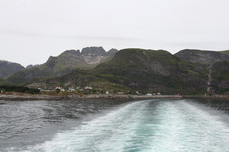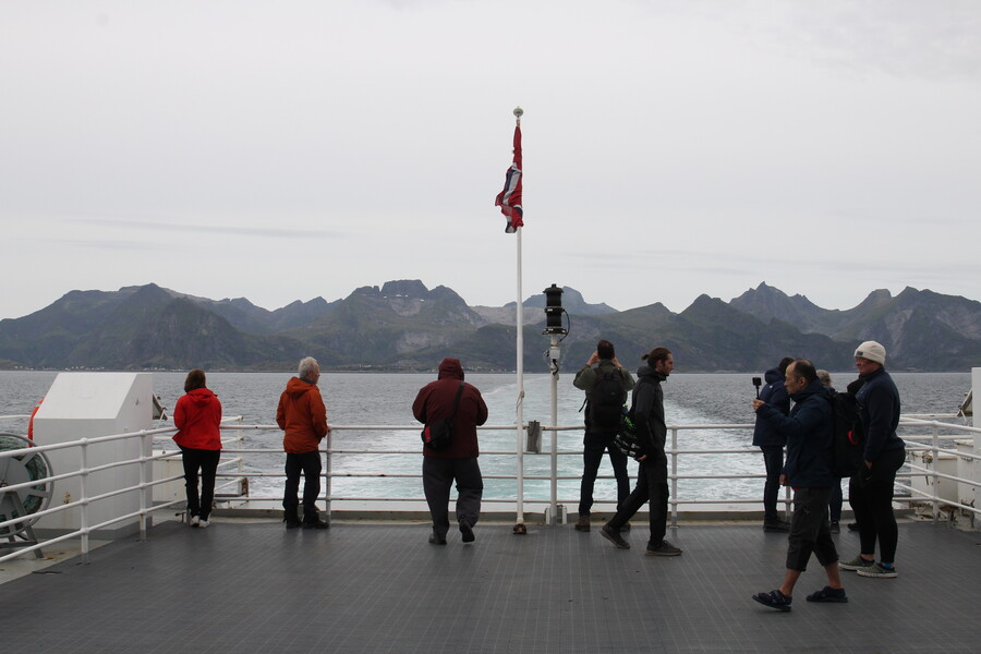 Przed godz. 9:00 ustawiamy się w kolejce, chociaż sami jeszcze nie wiemy, którym promem popłyniemy. Tego dnia dopołudnia odpływają dwa promy. Pierwszy o godz. 9:45, który do Bodo płynie siedem godzin i ma dwa przystanki na innych wyspach. Nie ma na nim żadnych rezerwacji. Drugi wypływa o godz. 11:00 i do Bodo płynie bezpośrednio, co zajmuje dwie godziny.