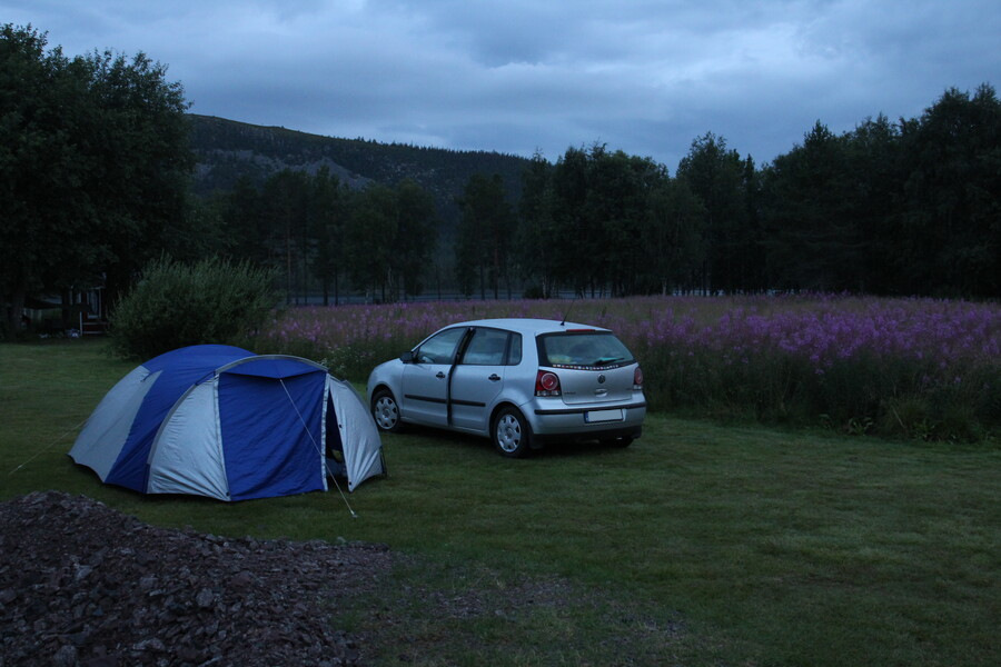 Niekończący się dzień sprzyja jeździe do późnych godzin. Miejsce, w którym rozbijemy namiot znajdujemy dopiero po północy. Wciąż jest widno.