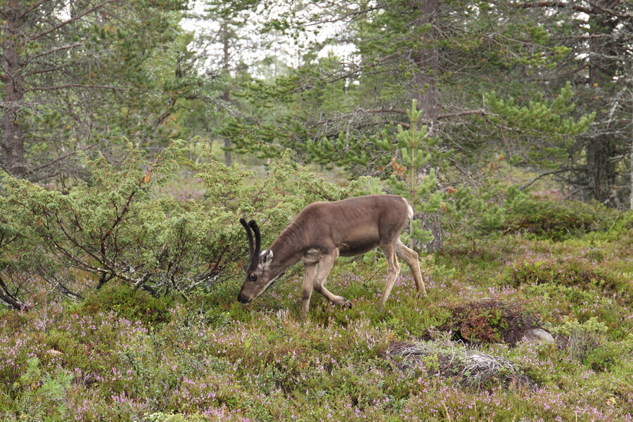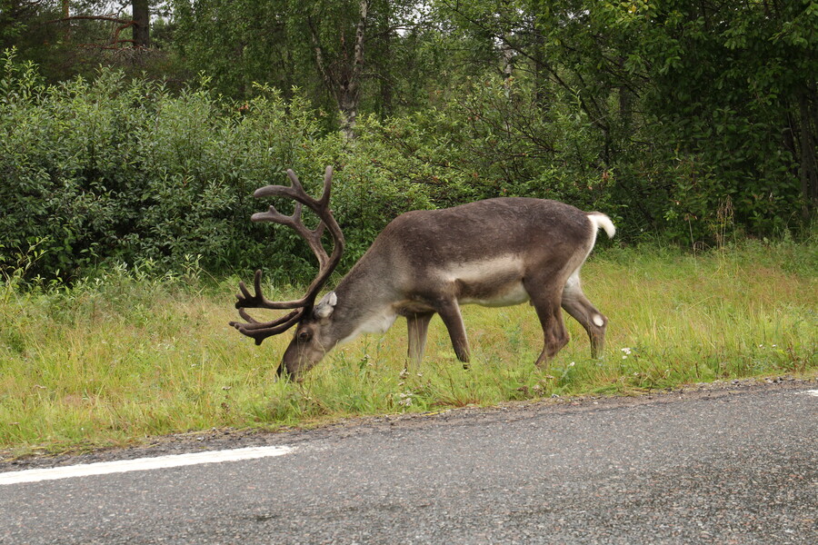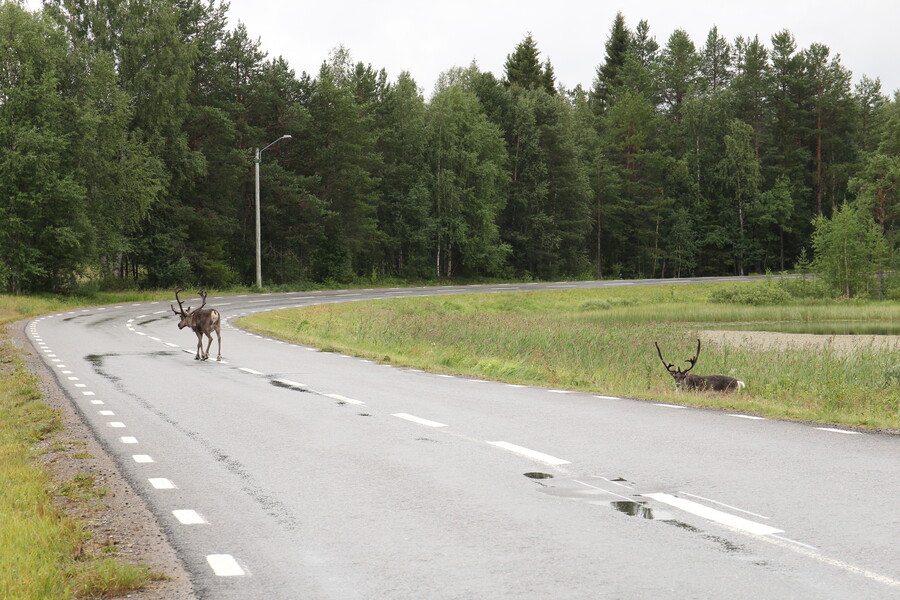 Tego dnia wjeżdżamy do Laponii. Krajobraz za oknem się zmienia. A przy wjeździe do miejscowości Vilhelmina z naprzeciwka środkiem drogi człapie w naszą stronę pierwszy renifer.