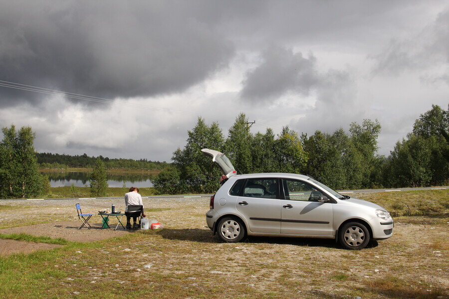 Na parkingu w lesie nad jeziorem robimy chwilę postoju. Obok nas parkuje Szwedka, kobieta koło 50. W swoim vanie ma puchatego kota i dwa białe psy labradory. Mówi nam, że przerobiła vana (ok. 20-letniego) i wybiera się nim w podróż dookoła Europy.
