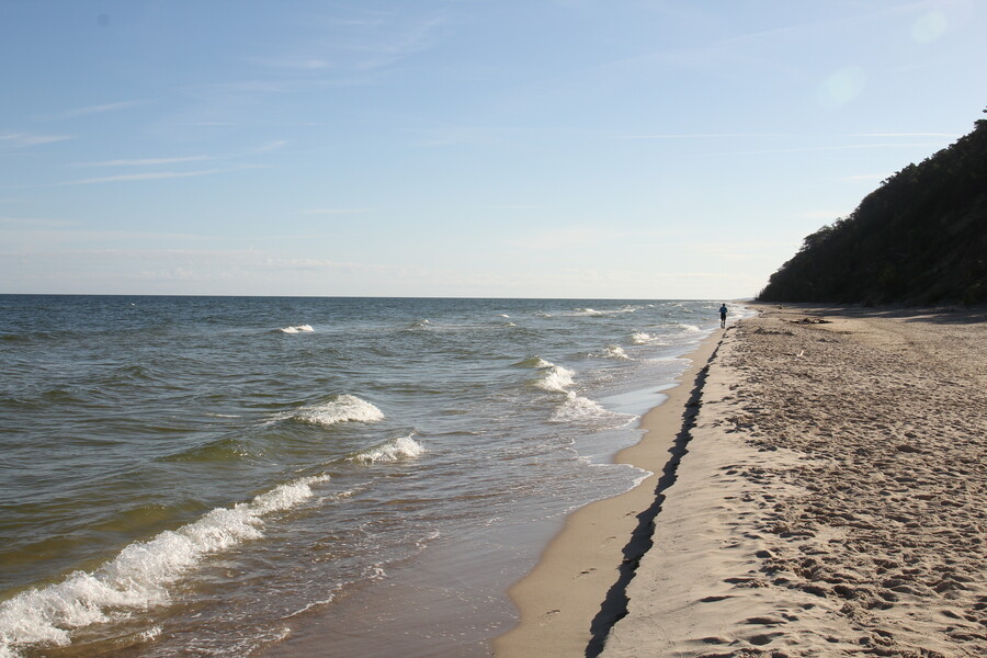 Kemping, na którym się zatrzymaliśmy na nocleg, jest oddalony tylko 20 minut od plaży. Żeby się do niej dostać trzeba przejść szlakiem przez Woliński Park Narodowy. Rano na plaży spotykamy dosłownie kilka osób. I są to biegacze, a nie plażowicze. Chwilę spędzamy na brzegu i wracamy składać obozowisko.