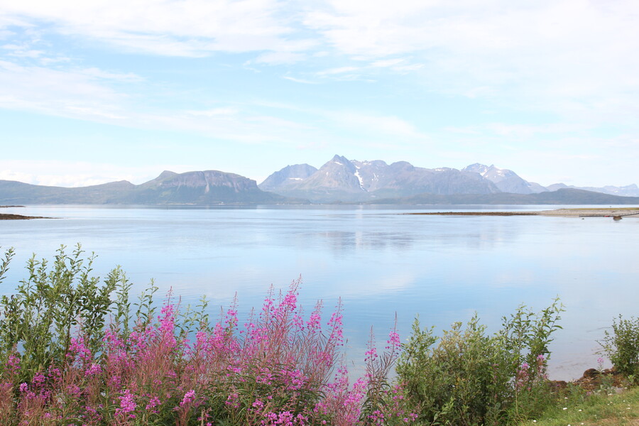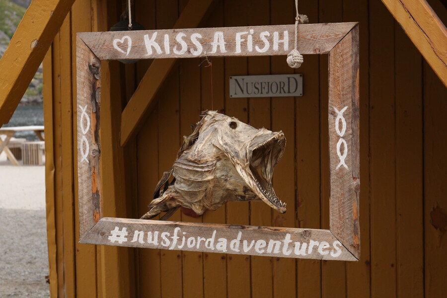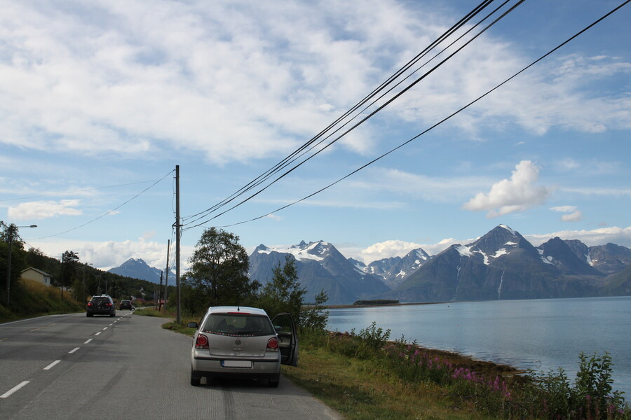 Część trasy z Nordkapp na Lofoty przebiegająca wzdłuż zatoki Lyngen jest wyjątkowo malownicza. Po obu stronach tego zbiornika wodnego górują majestatyczne szczyty pokryte śniegiem i poprzecinane wodospadami. W drodze na Lofoty zatrzymujemy się w sklepie z pamiątkami związanymi z Saamami. Oprócz tego, że oglądamy dużo „chińszczyzny”, Marcinowi trafia się okazja degustacji mięsa renifera i mięsa wieloryba.