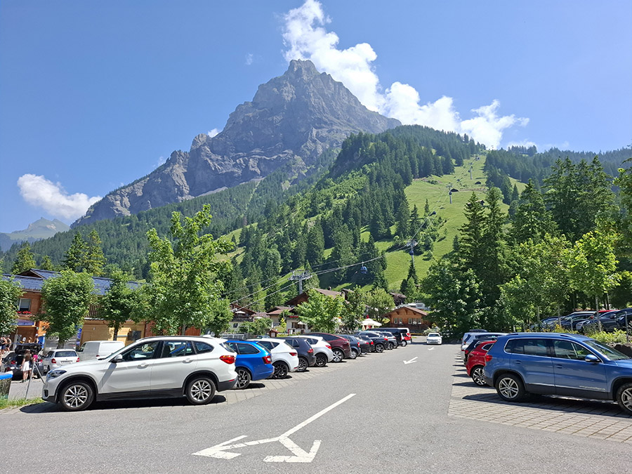Cztery minuty od kempingu podjeżdżamy do wodospadu Trummelbach. Parking jest bezpłatny i można tu stać samochodem do dwóch godzin. Do wodospadu prowadzi asfaltowa ścieżka, przy której stoi kasa z biletami. Cena biletu to 16 franków.
