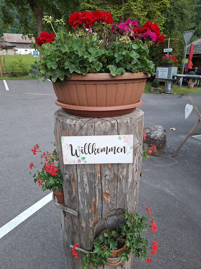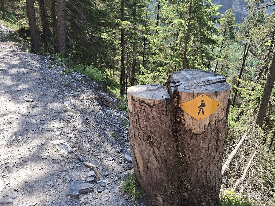 Trasa do jeziora opisana jako Familienrout nie jest taka łatwa jak ta prowadząca nad Morskie Oko. Droga jest szutrowa, z kamyczkami, żwirem i oczywiście trzeba wdrapać się pod górę. Po drodze mijamy źródełko, z którego można napić się wody i uzupełnić bidony. W końcu z zalesionego szlaku wychodzimy na kwietne łąki gdzie pasą się alpejskie krowy z przywieszonymi dzwonkami, a w tle jest widok na ośnieżone szczyty.