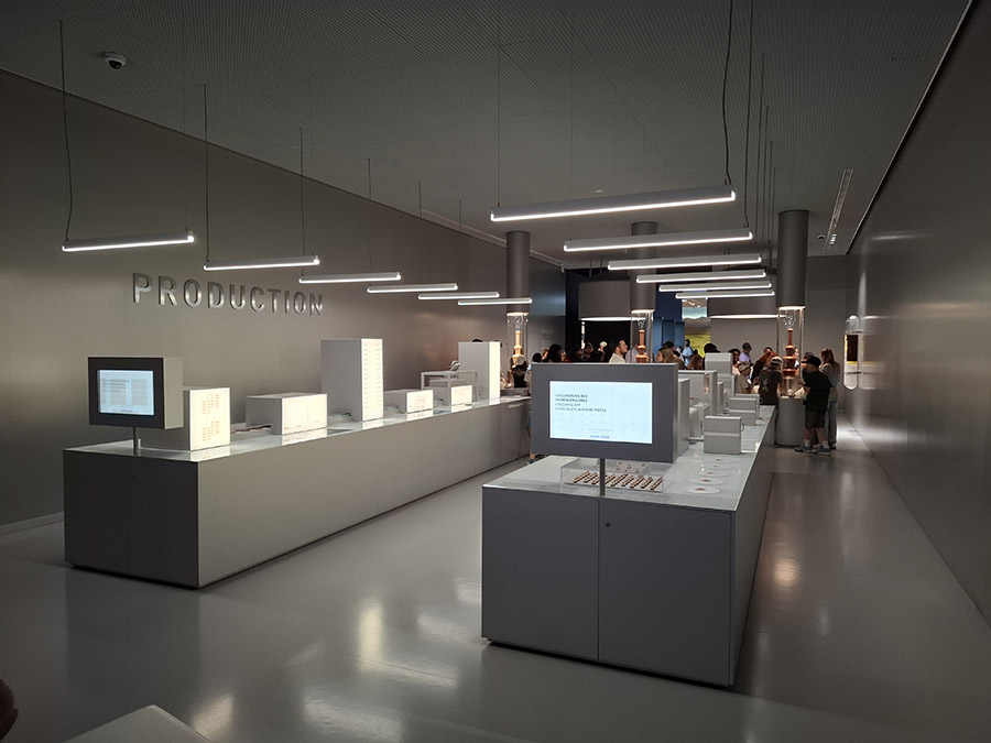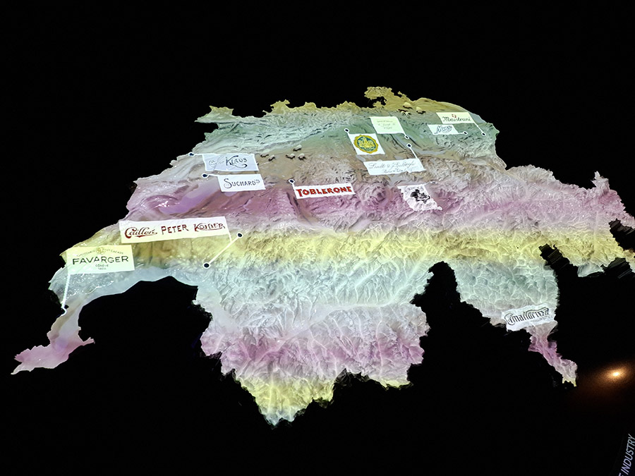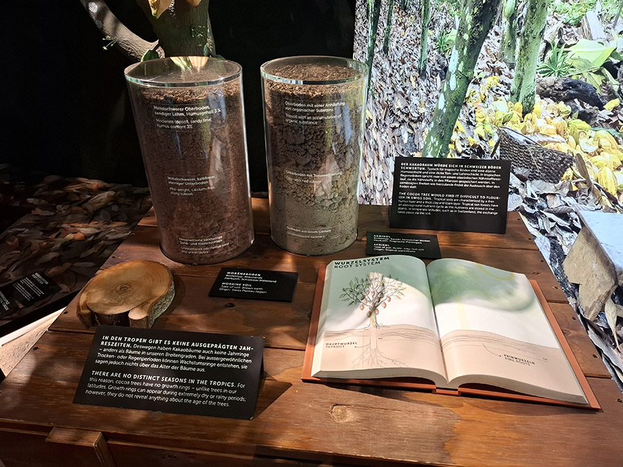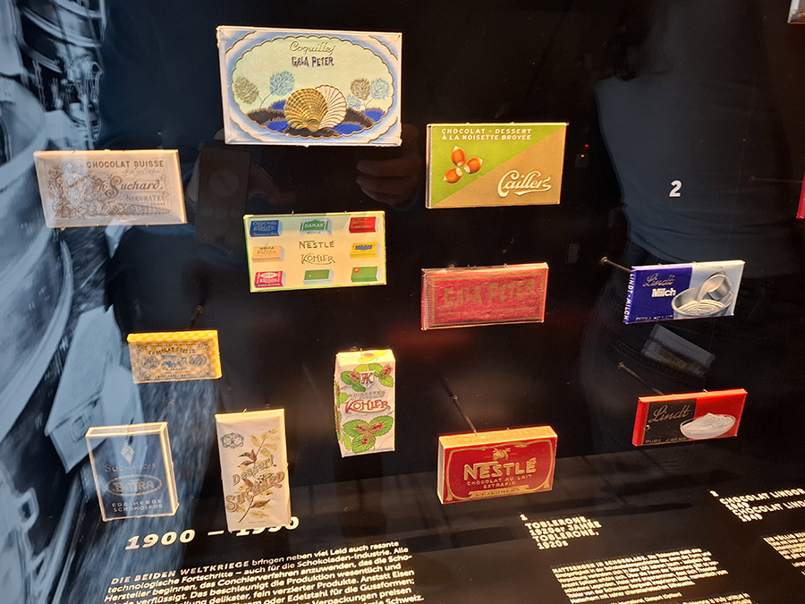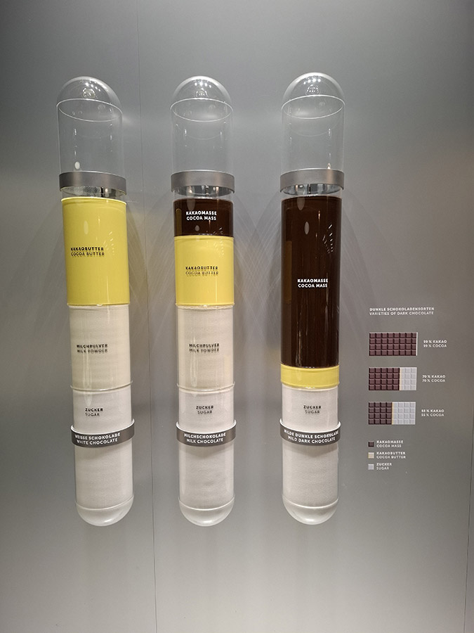 Pierwsza sala przedstawia sposób, w jaki pozyskuje się ziarna kakaowca, kolejna jak produkuje się czekoladę. Jest też historia przemysłu czekoladowego, z której dowiadujemy się m. in. że prekursorem czekolady w Szwajcarii był Cailler. Na ścianach w gablotach oglądamy archiwalne opakowania czekolad, czekoladek, bombonierek.