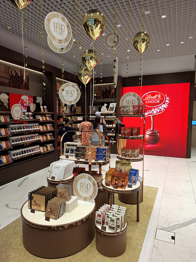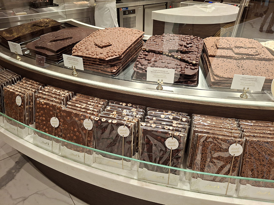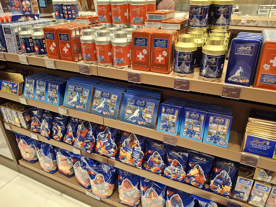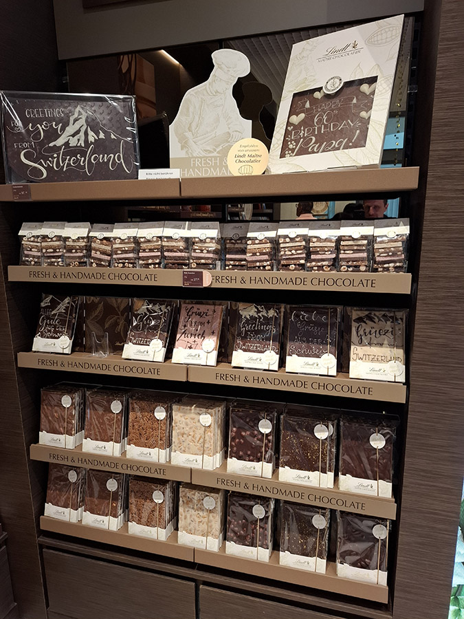 Po wizycie w muzeum każdy może skorzystać z usług kawiarni lub zrobić zakupy w sklepie, w którym półki uginają się pod niezliczonymi ilościami i rodzajami czekoladek i bombonierek od Lindt. Niewątpliwie jest to największy sklep czekoladą w jakim do tej pory byliśmy. Spotkaliśmy też smaki czekoladek Lindt jakie w Polsce nie są dostępne: miętowe, kokosowe czy matcha.