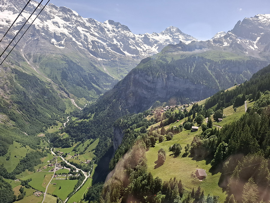W dolinie Lauterbrunnen zostawiamy samochód na parkingu i ze stacji Stechelbarg wjeżdżamy prawdopodobnie najbardziej stromą kolejką linową na świecie do alpejskiej wioski Murren. Stamtąd schodzimy do innej wioski: Gimmelwald. To są właśnie widoki w Szwajcarii na jakie liczyliśmy.