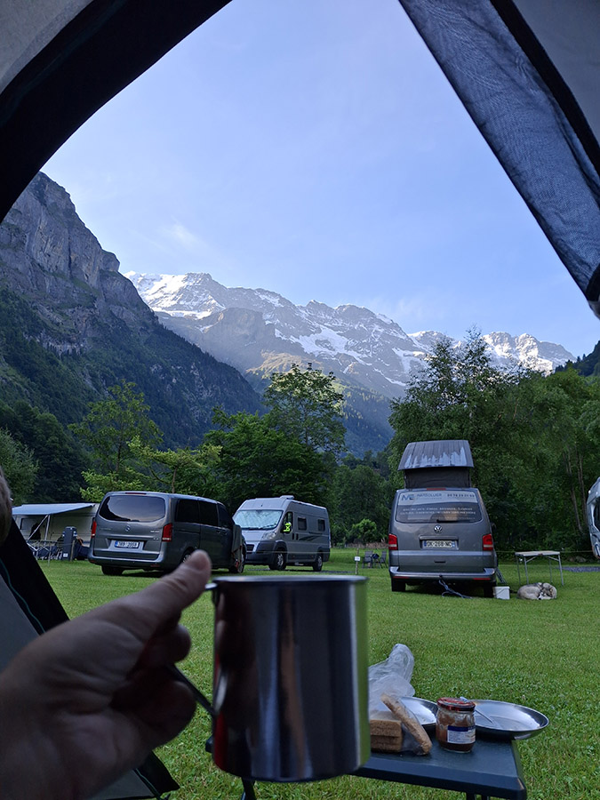 Aby dojechać do kempingu przejeżdżamy przez Zurich. Miasto wydaje nam się jakby było wielopoziome. Dołem jest autostrada, górą jeździ kolej. Na obrzeżach miasta rzuca się nam w oczy pan, który do plecaka ma przyczepiony lampion bno. O tym, jak popularny w tym kraju jest to sport przekonamy się w środę. Niestety tym razem mamy za mało czasu, żeby pozwiedzać szwajcarskie miasta.