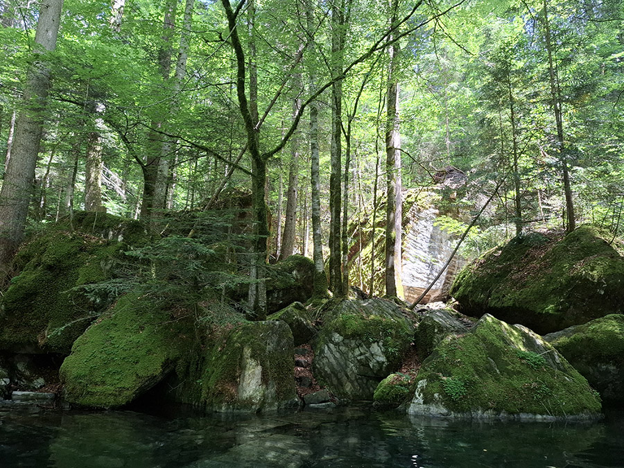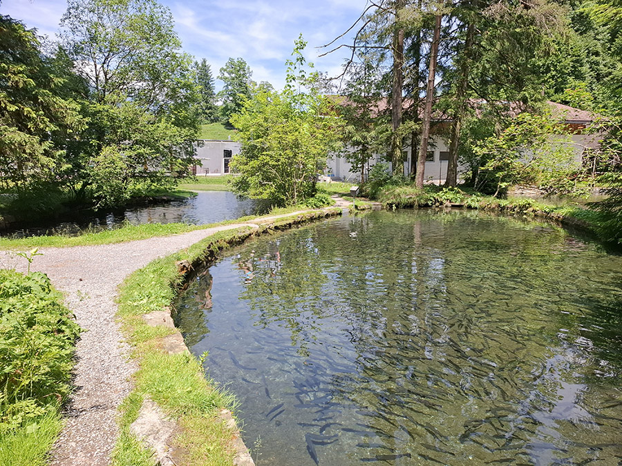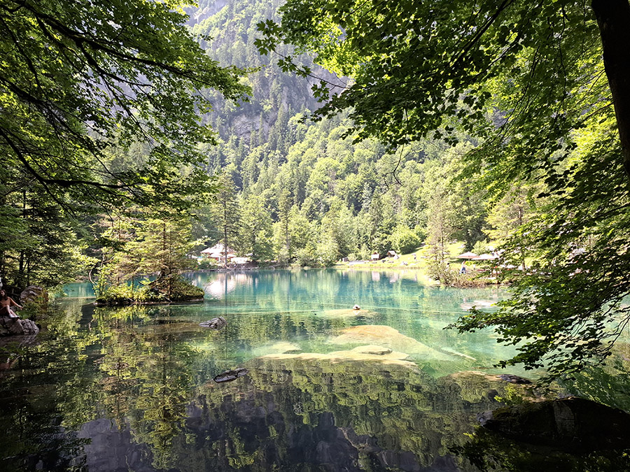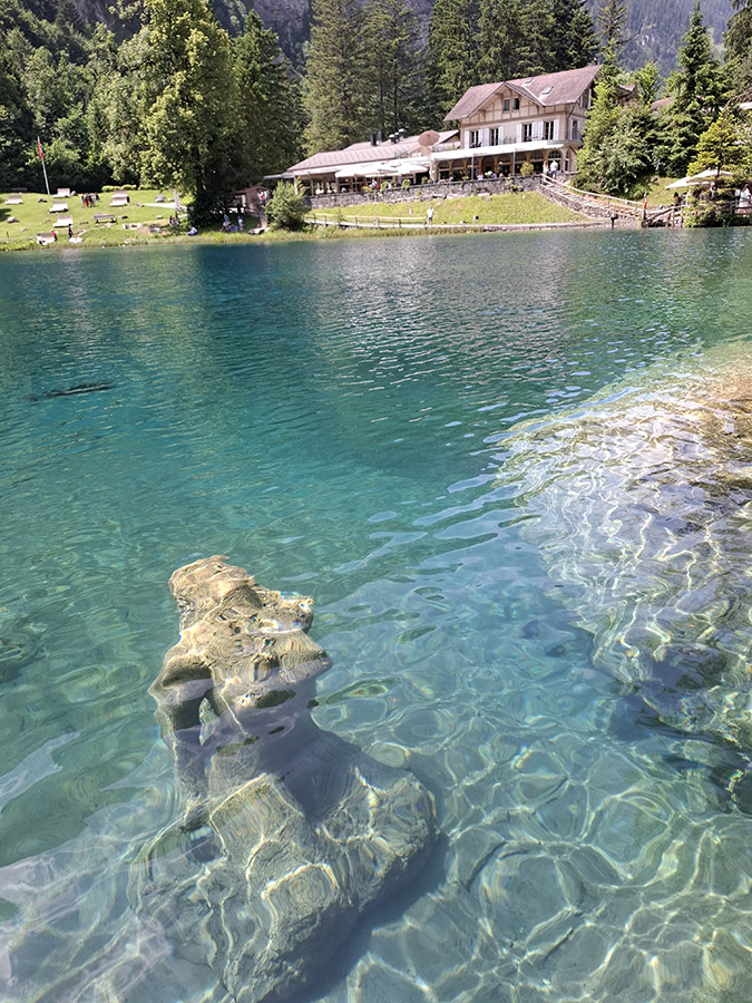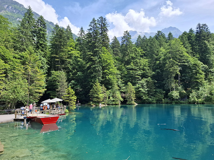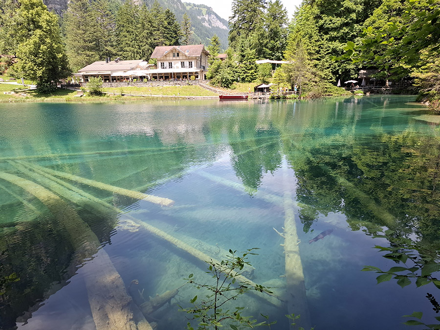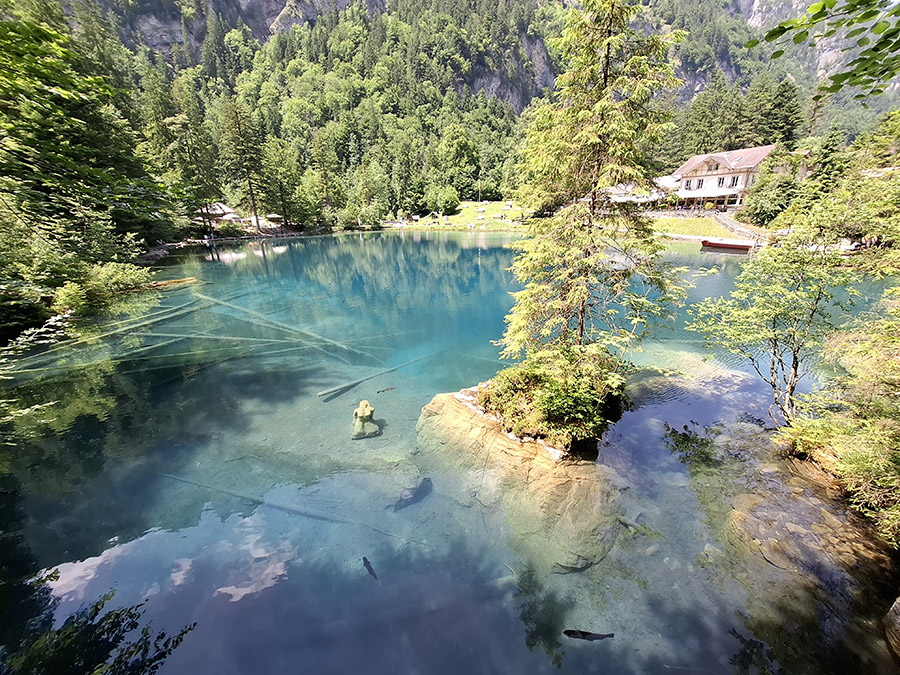 Kolejnym punktem, przy którym się zatrzymujemy jest Blausee. Parking kosztuje tu 5 franków, bilet 11 franków. Krajobraz tego parku natury o powierzchni 20 hektarów został ukształtowany 15 tys. lat temu przez obsunięcie się skał. Obecnie można tu pospacerować po leśnych ścieżkach i pooglądać krystalicznie czyste jezioro, w którym pływają karpie. Zaglądamy również do części pokazowej hodowli karpia, która dzięki czystości wody, dobrej jakości pożywienia i powolnemu wzrostowi czyni pochodzące stąd ryby produktem ekologicznym o wysokiej jakości.