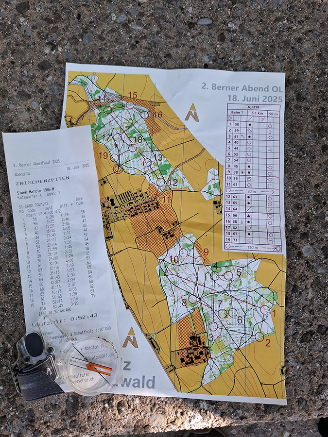 Z Blausee jedziemy na kolejny kemping. Szybko rozbijamy namiot, bo tego dnia czeka nas jeszcze trening orientacji sportowej pod nazwą 2. Berner Abendlauf w miejscowości Rubigen zorganizowany przez klub OlNorsk. W Szwajcarii biegi na orientację są bardzo popularne. To stąd pochodzą biegacze ze światowej czołówki w tej dyscyplinie sportu. Do wyboru jest kilka dystansów. Marcin biegnie najdłuższy i najtrudniejszy dystans mierzący w wariancie optymalnym 6,1 km i 19 PK z przewyższeniem 100 m. Ania wybiera trasę 3,2 km i 12 PK. Najpierw w biurze zawodów biegacze sami wybierają swoje minuty startowe i wpisują się na odpowiedniej liście. W ten sposób od godz. 17:15 do godz. 19:30 co minutę kilka osób wybiega na trasy z boksów startowych oddalonych o 1,1 km od biura zawodów.